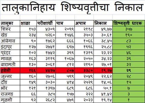 प्राथमिक शिष्यवृत्ती परीक्षेसाठी हवेली तालुक्यातून ४ हजार ४२५ विद्यार्थ्यी बसले होते. त्यापैकी ८०७ विद्यार्थी उत्तीर्ण झाल. त्यातील फक्त २९ विद्यार्थ्यांनाच शिष्यवृत्ती मंजूर झाली आहे. तब्बल ३३८० विद्यार्थी परीक्षेत अपात्र ठरले आहेत. पूर्व प्राथमिक (पाचवीच्या) शिष्यवृत्ती परीक्षेच्या गुणवत्ता यादीत परंपरेप्रमाणे शिरूर, खेड आणि आंबेगाव हे तालुके यावर्षीही अव्वल ठरले आहेत.