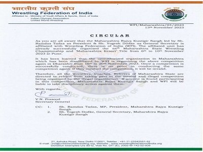 Maharashtra Kesari पुणे : भारतीय कुस्ती महासंघ (WFI )ने धाराशिव येथे १५ ते २० नोव्हेंबर दरम्यान भरविण्यात आलेल्या ‘महाराष्ट्र केसरी २०२३’ कुस्ती स्पर्धेत खेळणाऱ्या कुस्तीगीर तसेच पंच , कुस्ती प्रशिक्षक यांना या स्पर्धेत सहभागासाठी प्रतिबंध घातली आहे. महासंघाच्या प्रतिबंधानंतरही या स्पर्धेत सहभागी होणाऱ्यांवर महासंघ शिस्तभंगाची कारवाई करणार असल्याचे अधिकृत पत्र महासंघाने जारी केले आहे. Maharashtra Kesari
