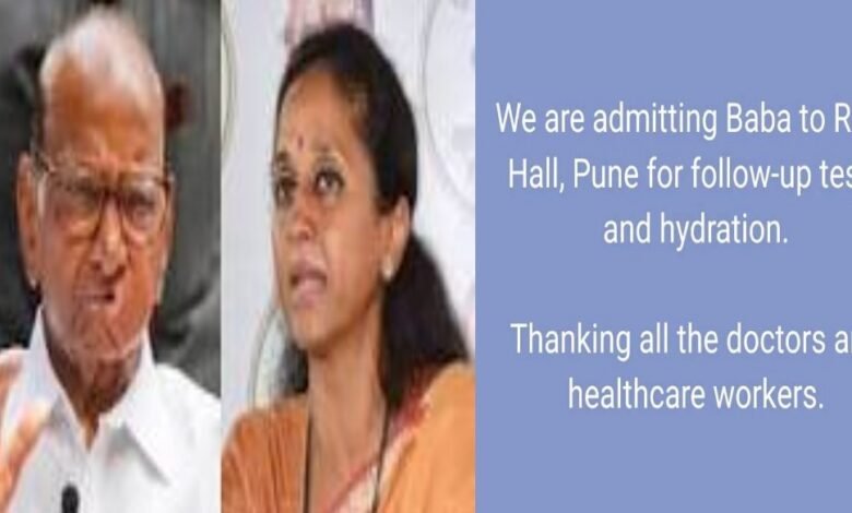 लेक सुप्रिया सुळे यांनी व्हाटसअप स्टेट्समध्ये म्हटले की, आम्ही बाबांना पुढील चाचण्या आणि हायड्रेशनसाठी पुण्यातील रुबी हॉलमध्ये दाखल करत आहोत.सर्व डॉक्टर आणि आरोग्यसेवक कर्मचाऱ्यांचे आभार असं त्यांनी म्हटले आहे.